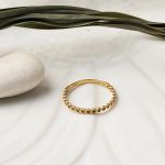 Bilezikci'nin özel tasarımı olan bu altın yüzük, mıhlı taşlarla süslenerek hem estetik bir görünüm sunar hem de taşların düşmesine karşı tam bir koruma sağlar. Taşların mıhlanarak işlenmesi, zarafet ve dayanıklılığı bir arada sunar.