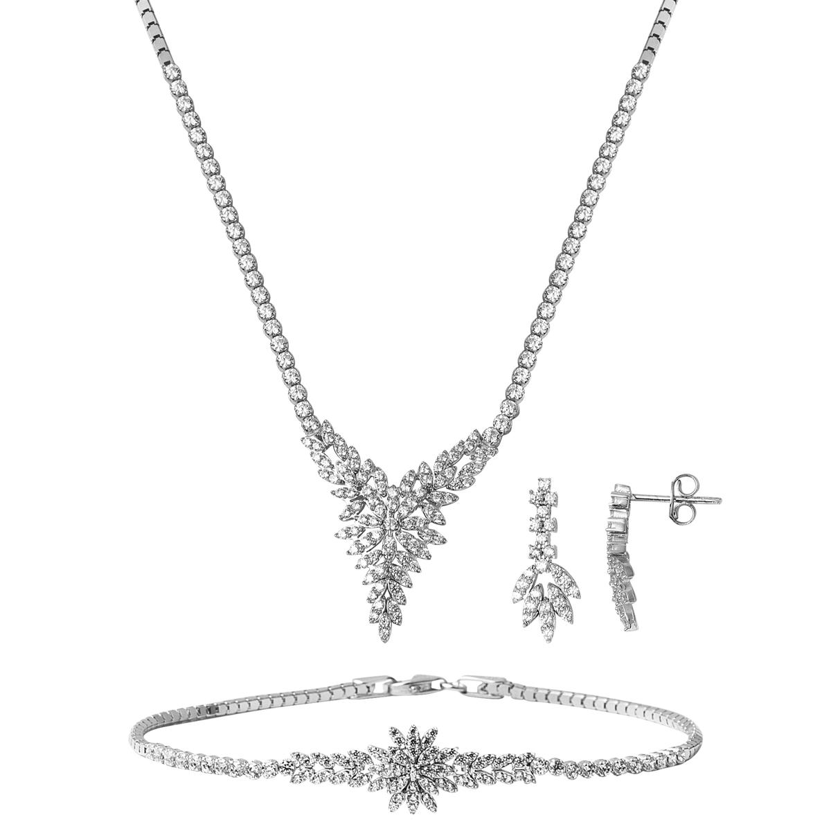Esnek ve Şık Tasarım: Setin her bir parçasındaki taşlar, mıhlanarak işlenmiştir, bu da her bir parçanın ayrı ayrı parıldamasını ve dikkat çekmesini sağlar. Bu set, hem günlük kullanım hem de özel etkinlikler için ideal bir seçenektir.