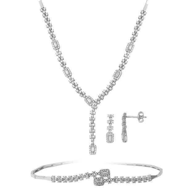 Esnek ve Şık Tasarım: Setin her bir parçasındaki taşlar, mıhlanarak işlenmiştir, bu da her bir parçanın ayrı ayrı parıldamasını ve dikkat çekmesini sağlar. Bu set, hem günlük kullanım hem de özel etkinlikler için ideal bir seçenektir.