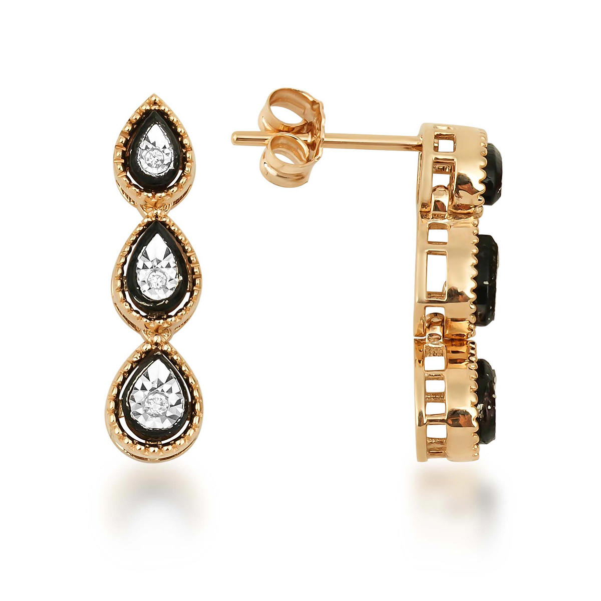 Elmas küpelerin üzerindeki siyah detaylar, altın rodaj ile elde edilmiş olup, bu modern dokunuş, küpelerin sofistike görünümünü daha da pekiştiriyor. Üzerindeki her bir taş, gerçek pırlanta kullanılarak, ışıltınızı her an parlatacak şekilde tasarlanmıştır.